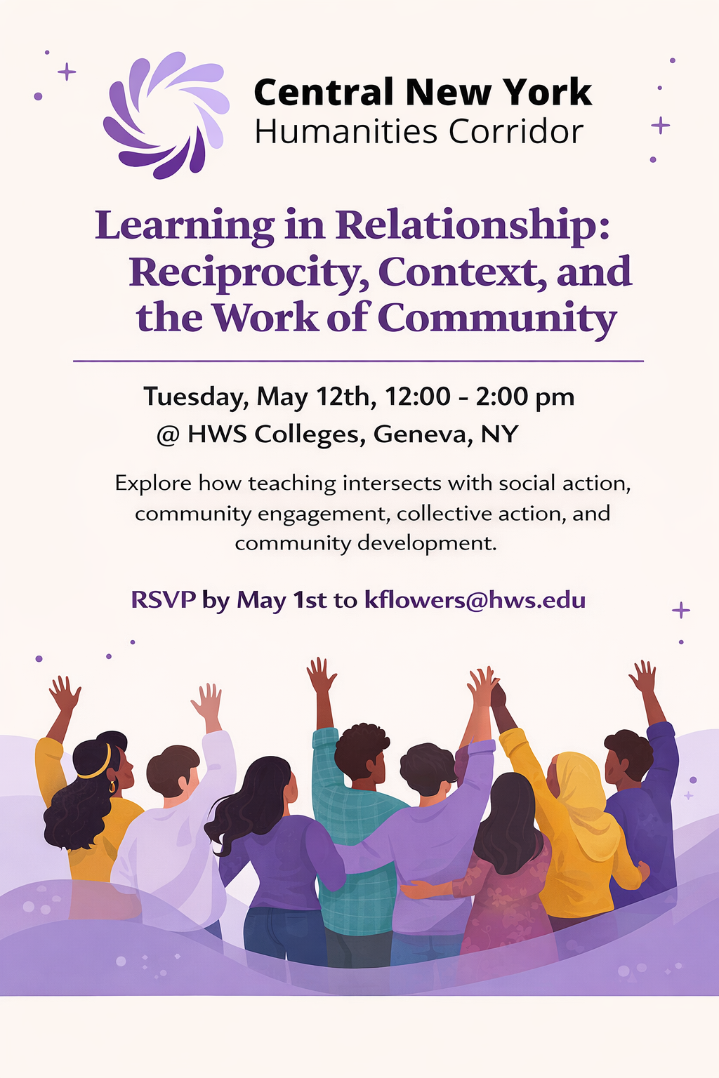 Building on a conversations at the U of R, hosted with support from the CNY Humanities Coordidor grant in December, and on May 8th with support from Partners for Campus-Community Engagement, Faculty from diverse campuses will gather at Hobart and William Smith Colleges in Geneva on May 12th (noon - 2pm) to explore how teaching intersects with social action, community engagement, collective action, and community development. Through shared examples and candid discussion, participants will examine where these approaches align, where they diverge, and what is gained or lost when one is taught without the other. Faculty colleagues will highlight lessons from the Social Action Institute, share best practices and how faculty frame learning that is responsive to community realities. Join us for lunch, networking, and idea sharing.